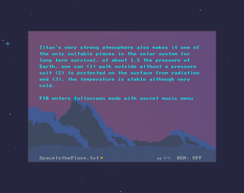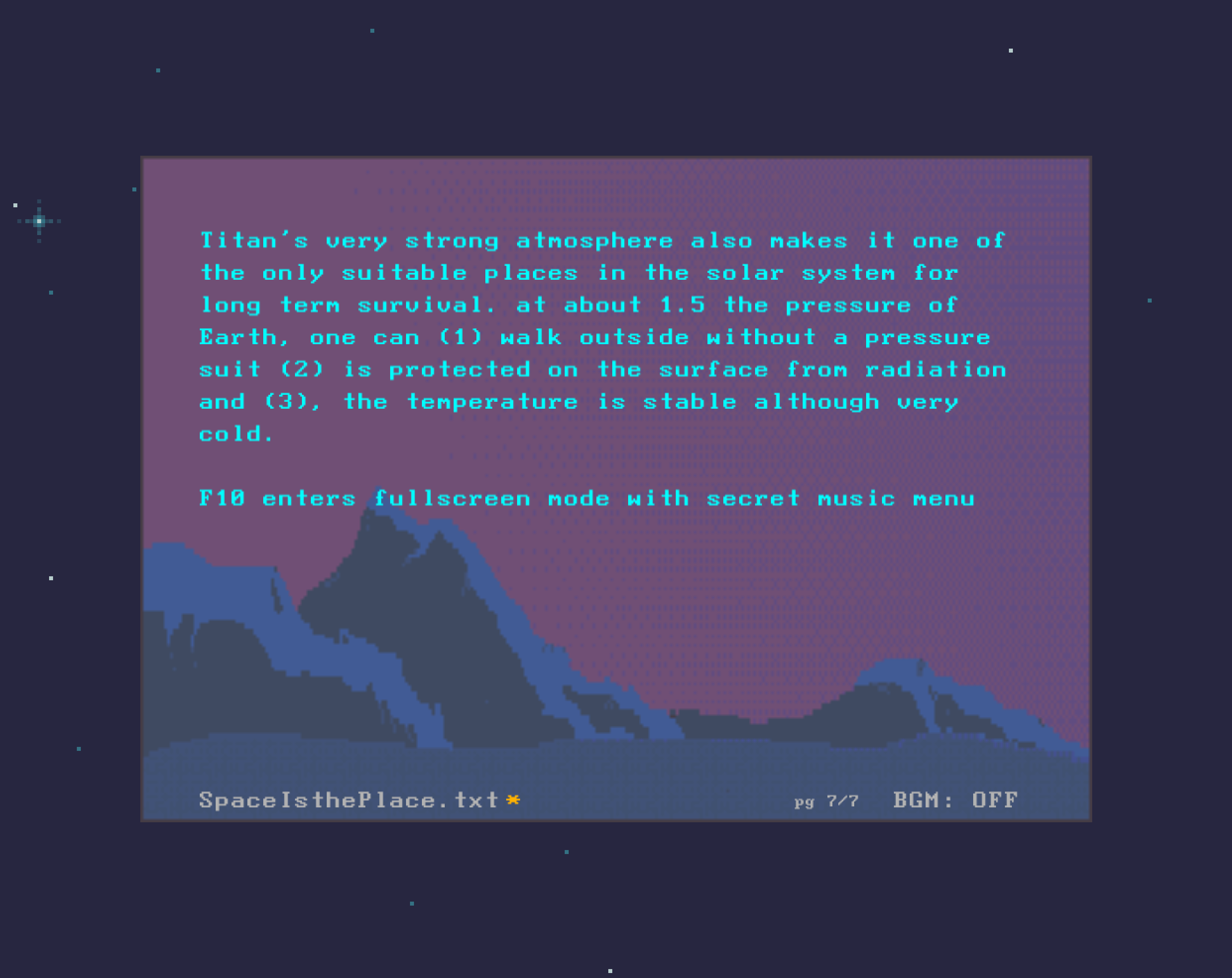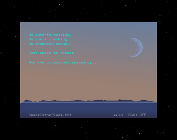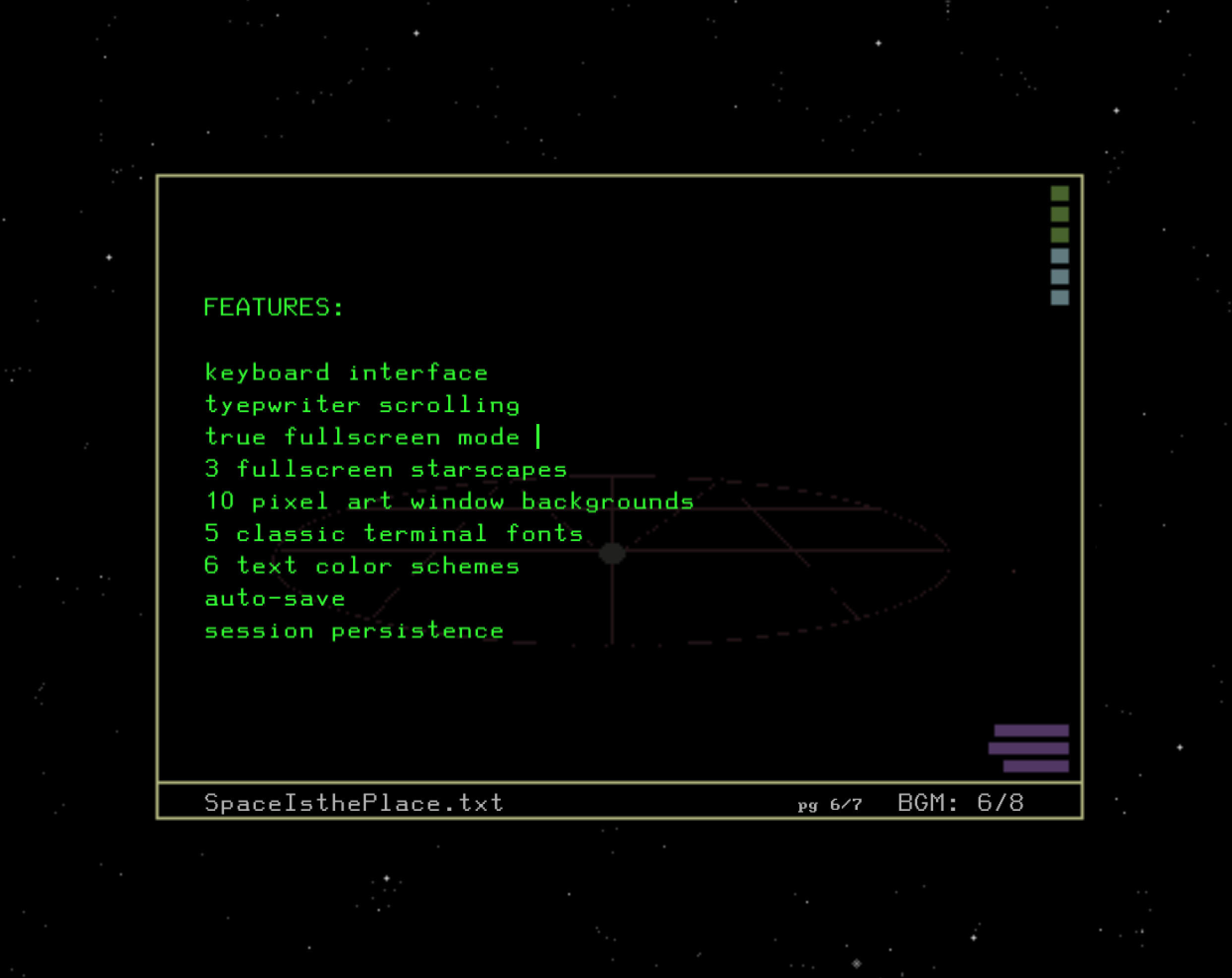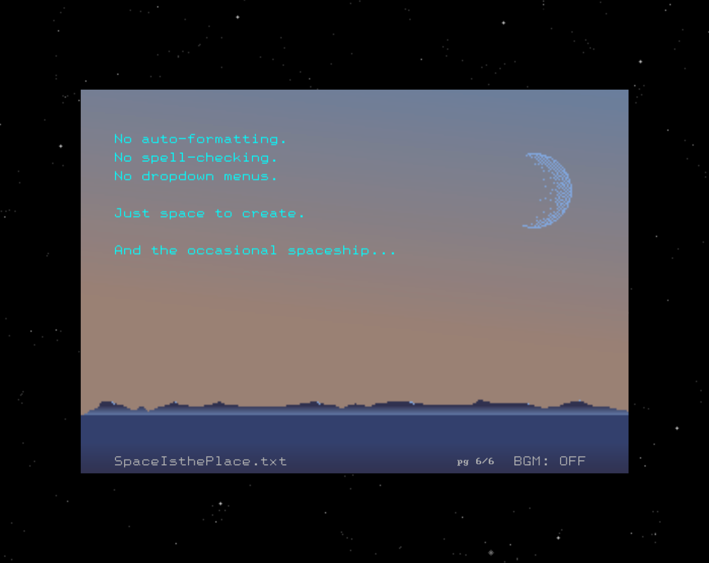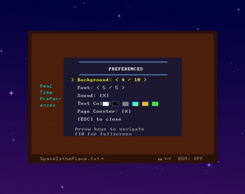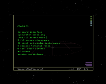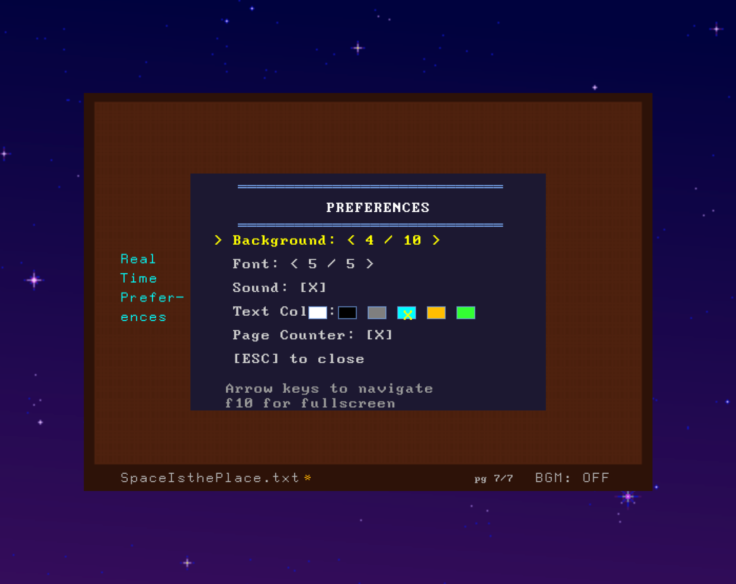 Five terminal fonts. Ten evocative backgrounds. Six text palettes. Typewriter scrolling. True fullscreen mode. Eight original BGM lofi loops. A pixel art spaceship that shows up when you've been idling too long.